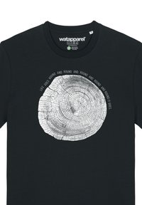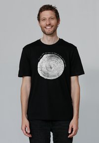 Zwart T-shirt met een zilveren boomring graphic in het midden. Korte mouwen, ronde halslijn, zachte stof en een relaxte pasvorm.