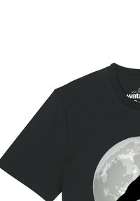Man draagt een zwart T-shirt met een afbeelding van een T-Rex die op een fiets rijdt voor een volle maan.