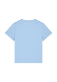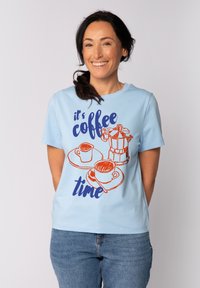 Lichtblauwe katoenen T-shirt met oranje illustraties van twee koffiekoppen en een moka-pot, met de tekst "het is koffietijd" in het blauw.