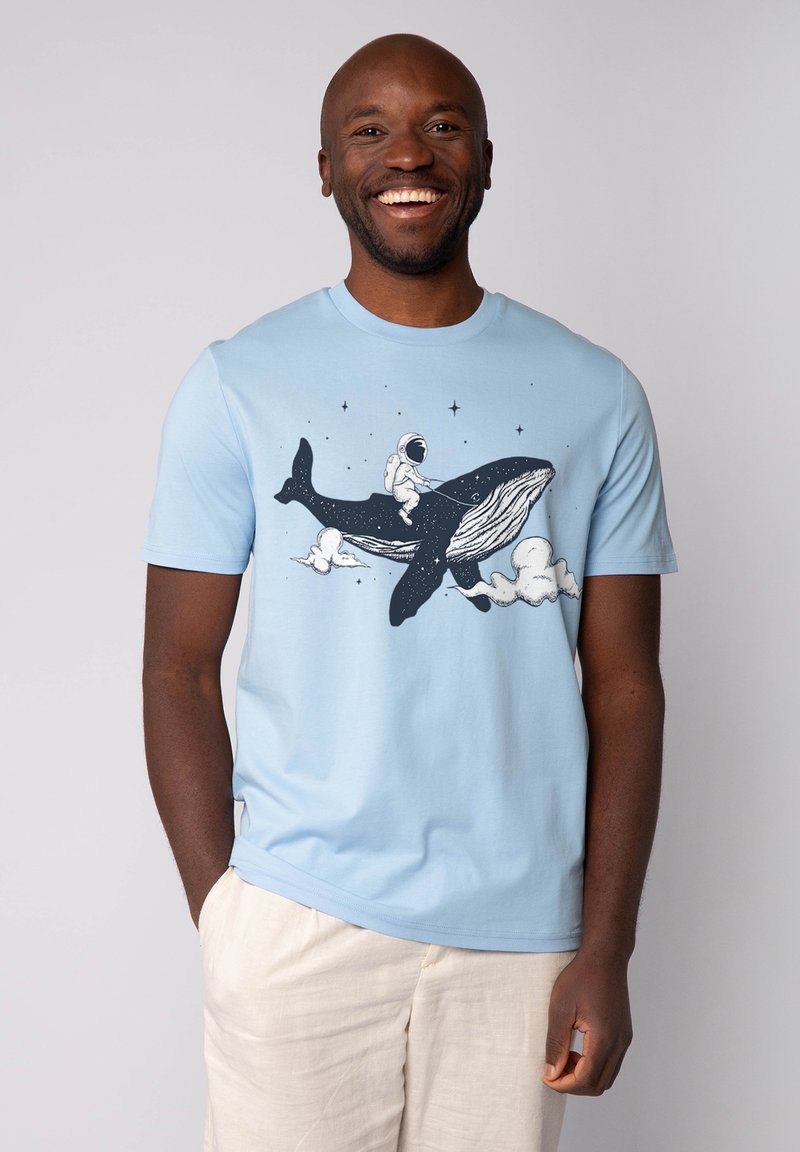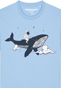 Lichtblauw katoenen T-shirt met een grafiek van een astronaut die op een walvis rijdt, omringd door sterren en wolken. Gladde textuur.