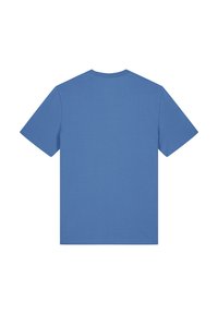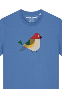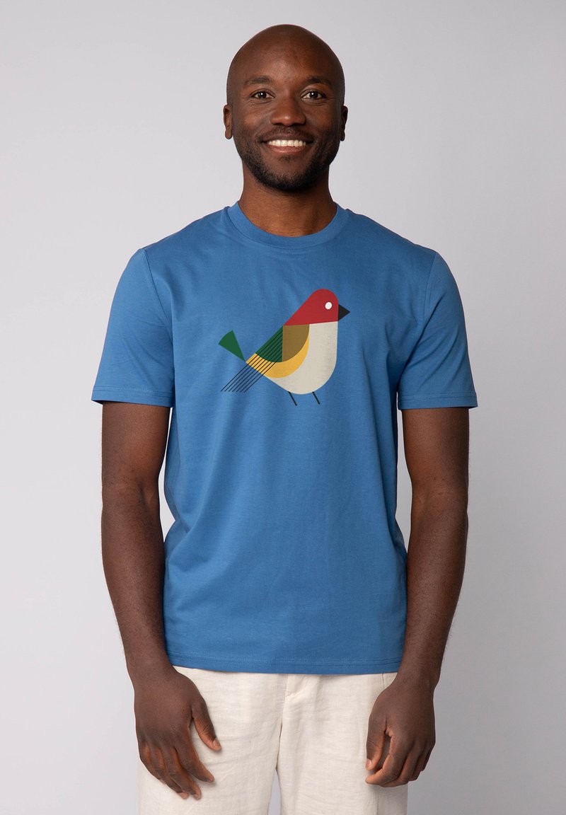 Blauwe T-shirt met korte mouwen met een grafisch vogels ontwerp in rood, geel, groen en zwart. Zachte stof met een relaxte pasvorm.