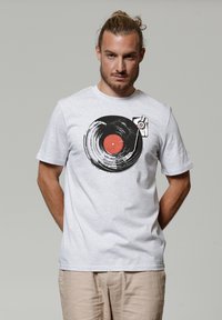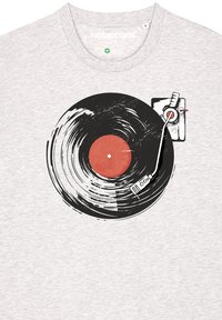 Grijze katoenen t-shirt met een zwart vinylplaat ontwerp met een rode midden en stylus, relaxte pasvorm, korte mouwen, standaard ronde hals.