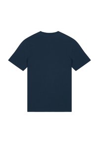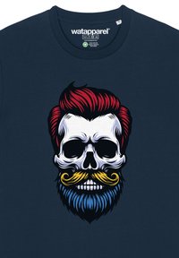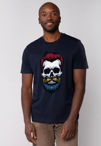 Marineblauwe t-shirt met een grafisch ontwerp van een schedel met een baard en snor, gekleurd in rood, geel en blauw. Korte mouwen, ronde hals.