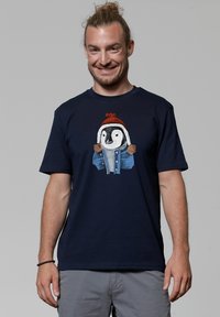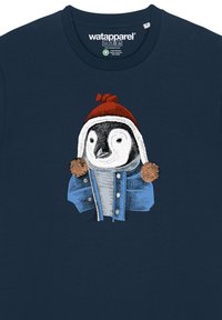 Marineblauwe T-shirt met korte mouwen met een afbeelding van een pinguïn die een rode hoed en een blauwe jas draagt. Van katoen met een zachte textuur.