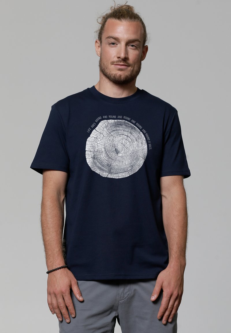Navyblauwe katoenen t-shirt met een cirkelvormige boomringgrafiek in het wit, met omringende tekst. Korte mouwen, ronde halsontwerp, relaxte pasvorm.