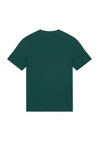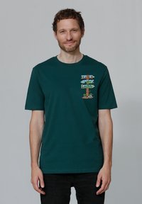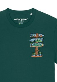 Smaragdgroene katoenen t-shirt met een kleurrafische afbeelding van borden met natuurelementen op de linkerkant van de borst. Ronde hals en korte mouwen.