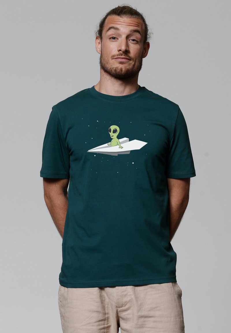 Donkergroene t-shirt met korte mouwen, versierd met een afbeelding van een groene alien die op een witte papieren vliegtuig zit, tegen een sterrenachtergrond.