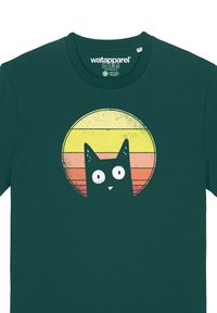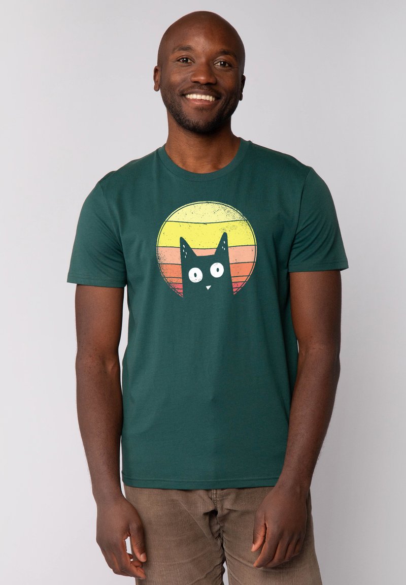 Groene katoenen t-shirt met een centrale afbeelding van een zwarte kat met witte ogen tegen een cirkelvormige gradient achtergrond van geel naar oranje.
