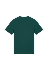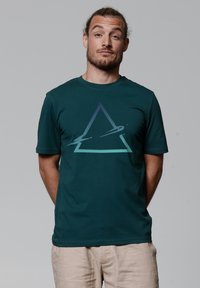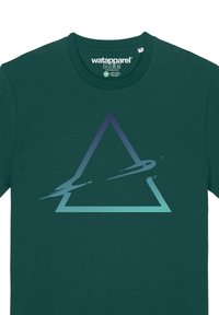 Tegengrove T-shirt met korte mouwen van katoen, met een vervagende driehoekafbeelding en een gladde textuur, gedragen met lichtgekleurde broek.
