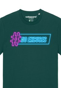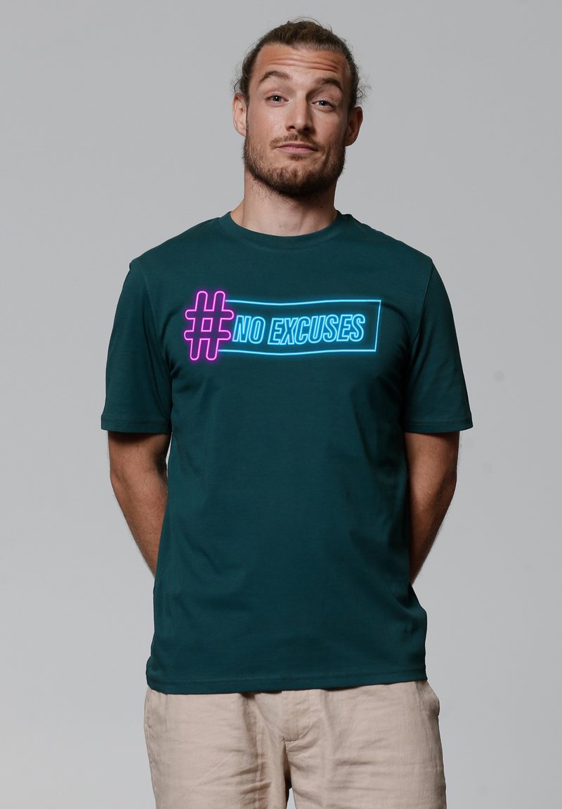 Donkergroene katoenen t-shirt met een neonroze en blauwe grafische print "#NO EXCUSES" op de voorkant. Korte mouwen en een ronde hals.