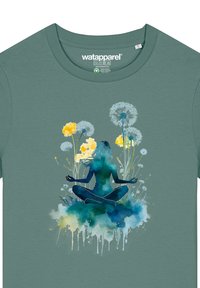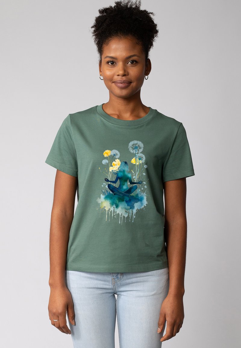 Groene t-shirt met korte mouwen met een aquarelprint van bloemen en een mediterende figuur, gemaakt van zacht katoen.