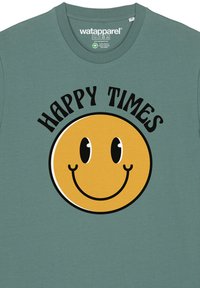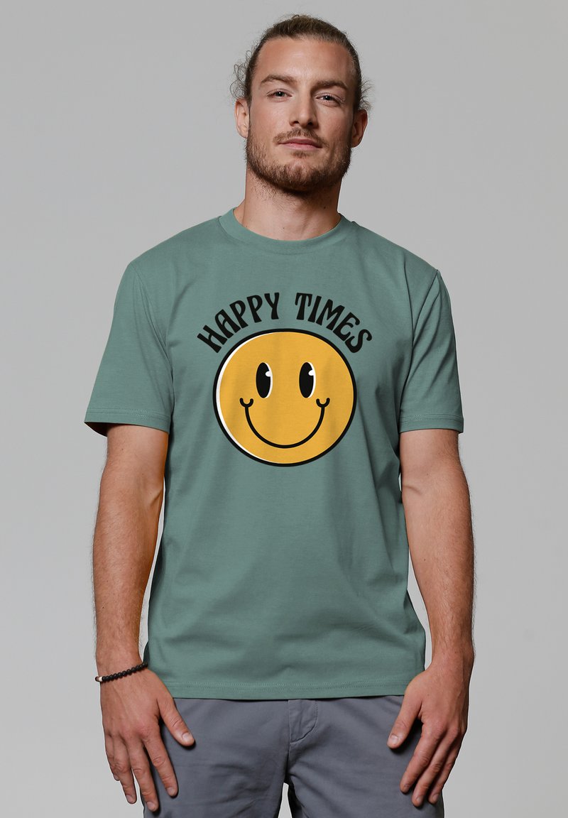 Groene katoenen t-shirt met een grote gele smiley-gezichtafbeelding en de tekst "HAPPY TIMES" erboven. Korte mouwen, ronde hals.