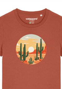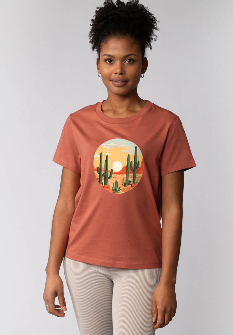 Roestkleurig katoenen t-shirt met een ronde woestijnscène met cactussen, bergen en een zon op de voorkant. Korte mouwen en ronde hals.