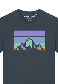 Navyblauwe katoenen t-shirt met een bergafbeelding in paars, groen en oranje tegen horizontale kleurenstrepen. Ontworpen met een ronde hals.