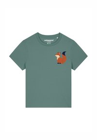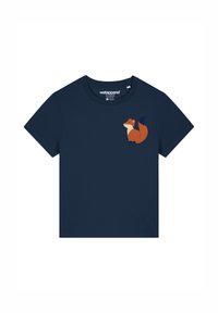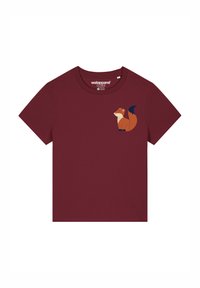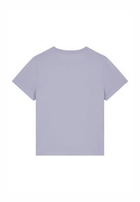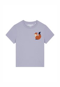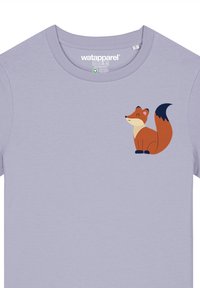 Lila T-shirt met korte mouwen van katoen, met een grafische weergave van een gestileerde oranje vos op de bovenste linkerkant van de borst.