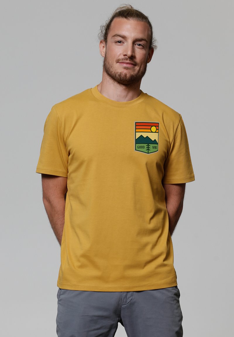 Geel katoenen T-shirt met ronde hals, korte mouwen en een voorste grafische applicatie met bergen, zon en de tekst "GOOD VIBE."