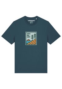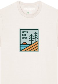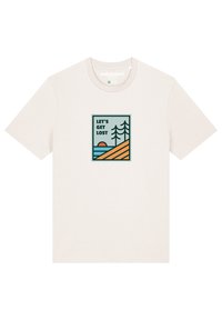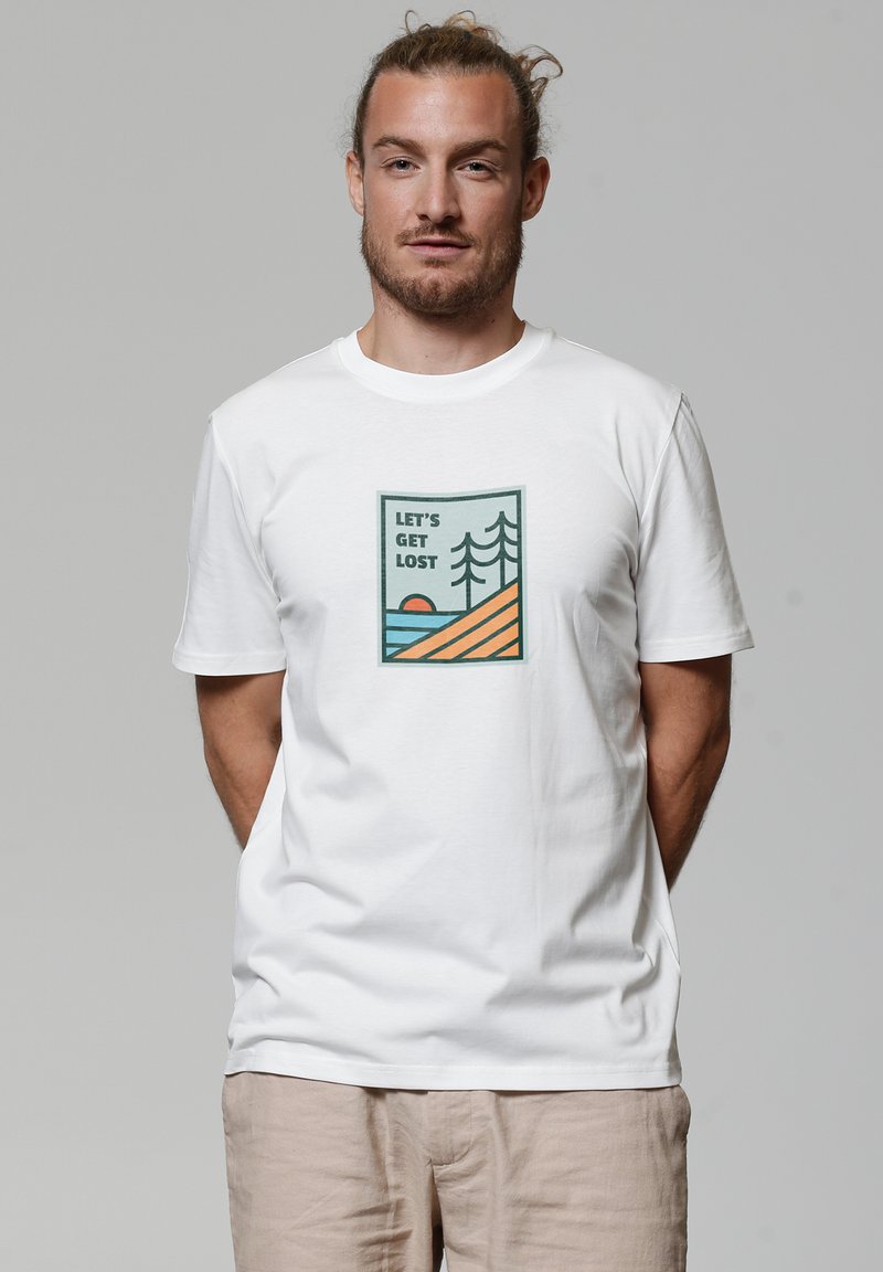 Witte t-shirt met korte mouwen, voorzien van een grafische print met groene bomen, een oranje zon en een gestreept landschap in lichtblauwe en oranje tinten.