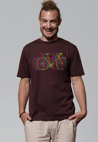 Bordeaux t-shirt met een kleurrijke fietsafbeelding in roze, geel, groen en blauw. Korte mouwen en lichtgewicht katoenmateriaal.