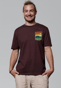 Bordeaux-kleurig T-shirt met korte mouwen, voorzien van een grafische afbeelding op de linkerborst met een zonsondergang, bergen en bomen, gedrukt in groen, oranje en geel.