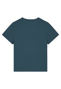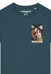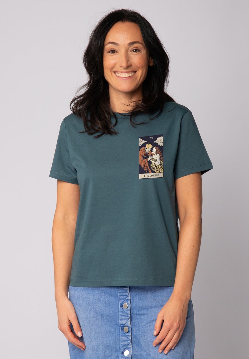 Teal katoenen t-shirt met korte mouwen en een ronde hals. Voorzien van een grafische patch met het label "De geliefden" en een ingewikkelde illustratie.