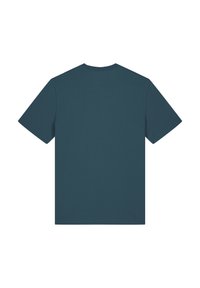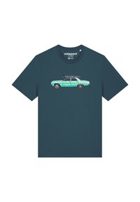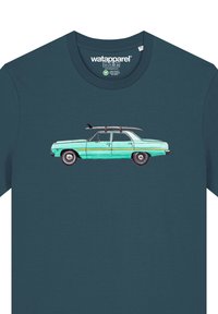 Teal t-shirt met korte mouwen, voorzien van een grafiek van een lichtblauwe vintage auto met een surfplank op het dak, gecombineerd met beige broek.