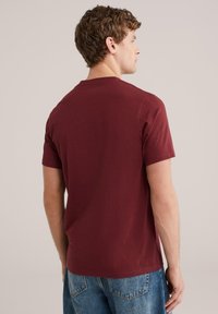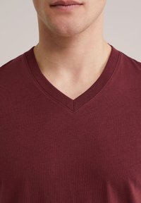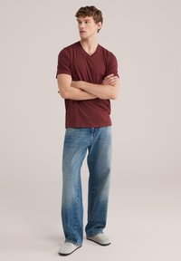 Jonge man met krullend haar, gekleed in een effen bordeauxrode V-hals T-shirt en een blauw spijkerbroek, staand tegen een licht beige achtergrond.
