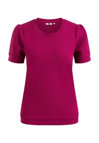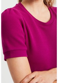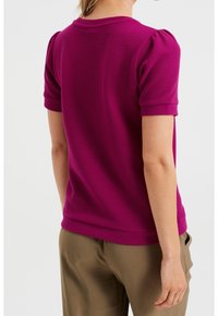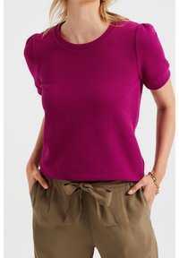 Fuchsia textuur short-sleeve top met een ronde hals. Gecombineerd met bruine hoog-getailleerde broeken met een strikdetail op de taille.