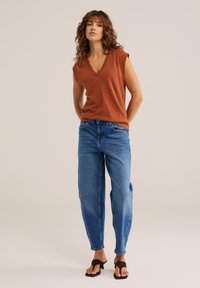 Vrouw met golvend bruin haar, gekleed in een roestkleurige mouwloze top met V-hals en blauwe jeans, staand met haar handen achter haar rug.