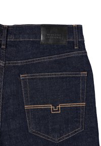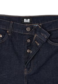 Jonge man staand met één hand in de zak van marineblauwe jeans, dragen van een wit T-shirt en witte sneakers tegen een effen achtergrondskleur.