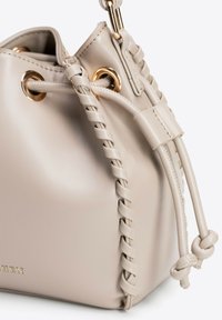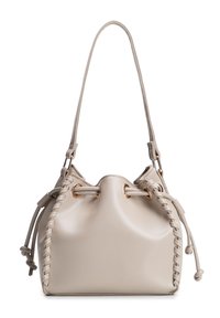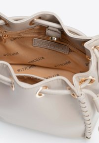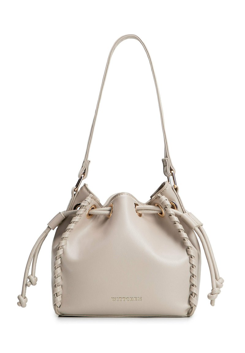 Beige leren bucketbag met gevlochten zijdetails, trekkoordsluiting, enkele schouderriem en een gouden "WITTCHEN" logo aan de voorkant.