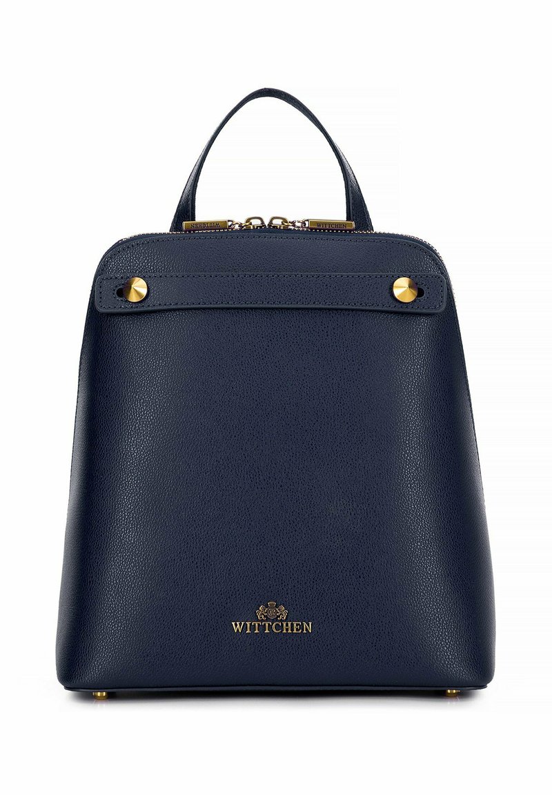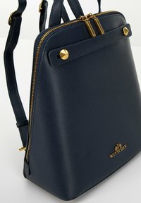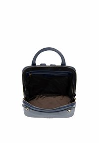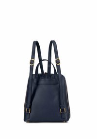 Marineblauwe leren rugzak met een gestructureerde afwerking, gouden hardware-accenten, een handvat aan de bovenkant en een ritssluiting. Bevat het merkembleem onderaan.