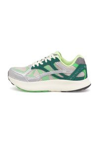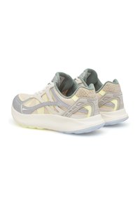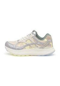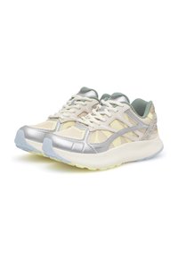 Lichte sportschoenen met een bovendeel van mesh in beige en zilver met reflecterende accenten, een gevoerde zool en gestructureerde details op de hiel.