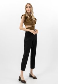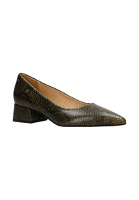 Persoon die zwarte cropped broek draagt en lage blokhakbruine schoenen met slangenhuidpatroon, staand op een witte vloer.