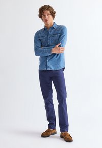 Man draagt donkerblauwe broek, lichtblauw denim overhemd en bruine suède loafers, staat met één hand in de zak.