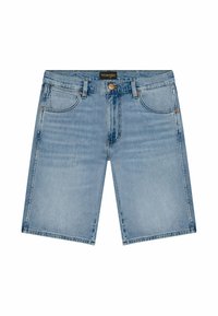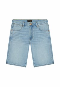 Lichte blauwe denimshorts met een regular fit, vijf zakken en een rafelige zoom. Draagt witte sokken en beige sportschoenen.