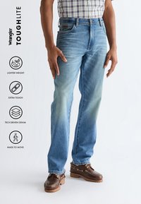 Man draagt lichtblauwe spijkerbroek en bruine schoenen, staand tegen een witte achtergrond met Wrangler ToughLite-functies vermeld.