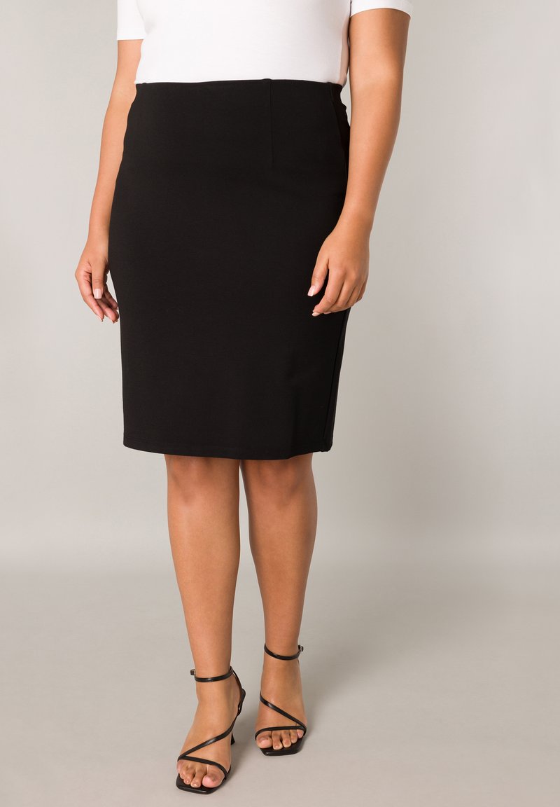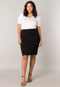 Vrouw die een zwarte kokerrok tot op de knie, een wit bovenstuk en zwarte sandalen met hoge hakken en bandjes draagt, staand tegen een neutrale achtergrond.