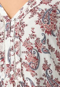 Vrouw met blond haar, gekleed in een wit tuniek met lange mouwen met rood-blauwe bloemige paisleypatronen en een blauwe spijkerbroek.