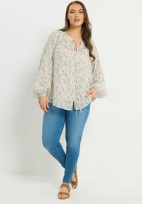 Vrouw draagt een lichte, lange mouwen bloemenblouse met knopen en een gestrikte halslijn, gecombineerd met een blauwe spijkerbroek, staand tegen een witte achtergrond.