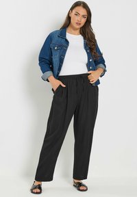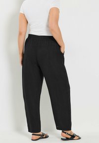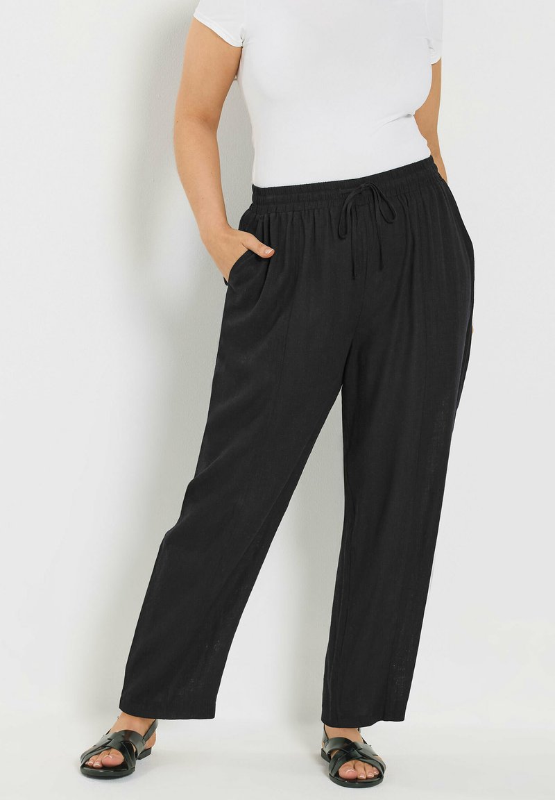 Vrouw draagt losse zwarte broek met trekkoord, wit shirt met korte mouwen en zwarte sandalen, staand met één hand in de zak.