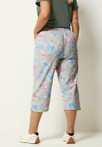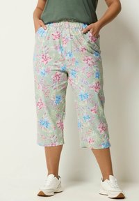 Onderlichaam met lichtgroene cropped broek met roze en blauwe bloemenprint, handen in zakken, gecombineerd met witte sneakers.