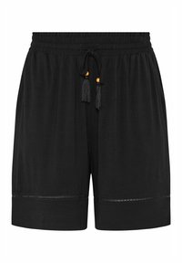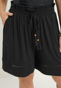 Blonde vrouw met zonnebril op haar hoofd, gekleed in een zwart mouwloos topje en zwart, hooggetailleerd short met trekkoord, staand voor een beige achtergrond.