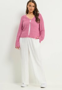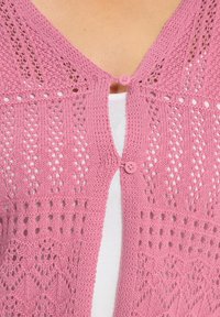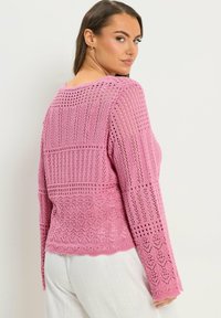 Vrouw met lang bruin haar, een roze gebreid vest over een witte top, glimlachend en poserend tegen een effen achtergrond.