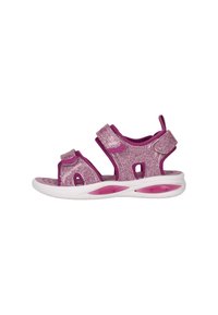 Roze glittersandalen met witte rubberen zolen, voorzien van twee verstelbare banden, open zijkanten en een gevoerde voetbed voor comfort.